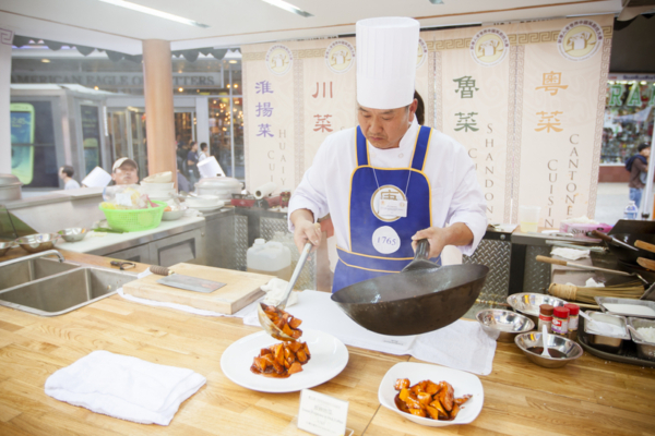 在大蘋果中心,頭戴白色長帽的廚師在煙霧、火焰中,以傳統的技術和食材、配料,不加入任何變異的現代元素,炒出了陣陣誘人的香氣。在衆人期盼下,侍女擡著古風的木檯和精美食器,捧出了一道道色香味俱全,恢復正統的中華南北名菜。