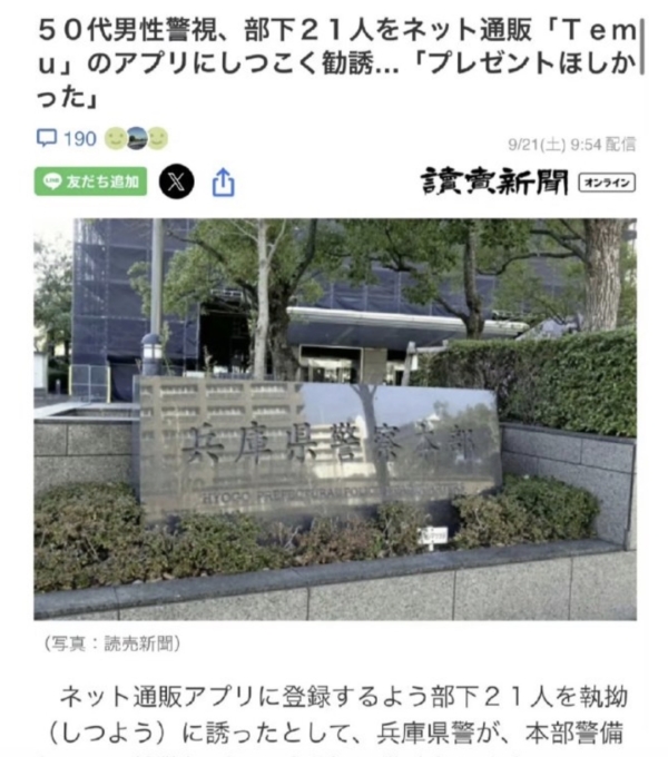據日本《讀賣新聞》報導,9月20日,日本兵庫縣警察廳公布了一則違紀公告,對在縣警察廳本部保衛科工作的一名男警官作出警告處分,原因是該警官為了獲得海外版拼多多temu上「砍一刀」的獎勵,命令其21位下屬下載安裝temu。