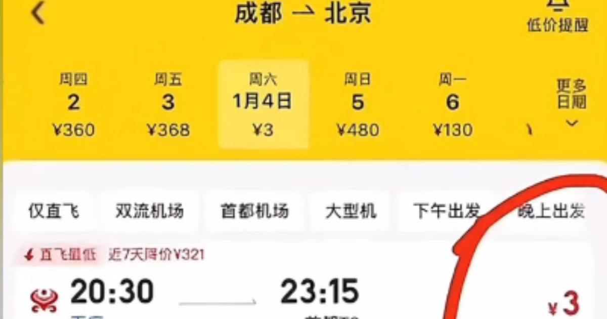 【新唐人北京時間2024年12月29日訊】近日,中國大陸多名網友在某旅遊平台搶到成都飛往北京的機票,票價僅3元(人民幣,下同)的消息,引發關注。