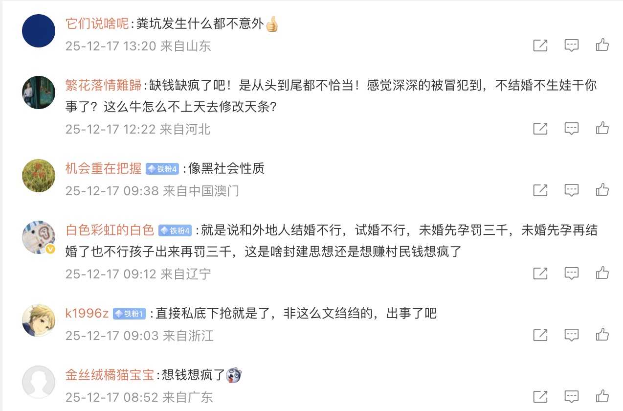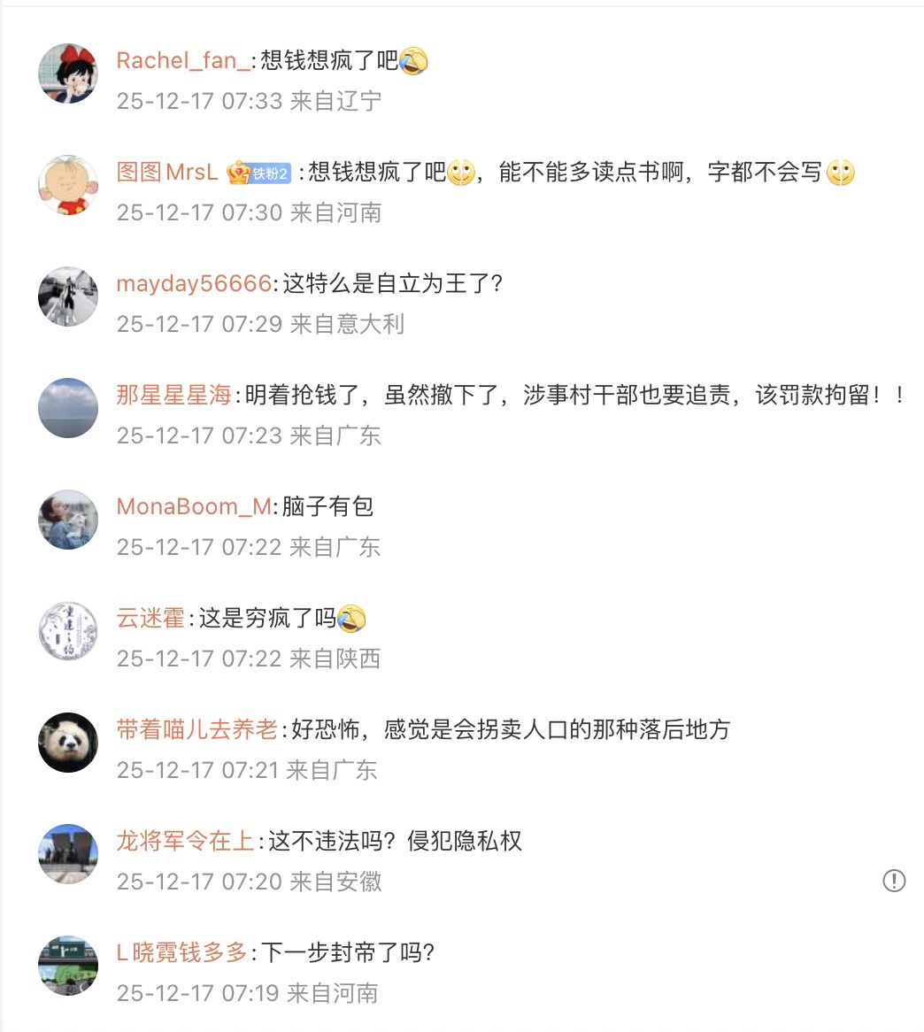 此告示引發眾多網友吐槽,「這真是想錢想瘋了,這是給村幹部養老錢嗎」、「想錢想瘋了」、「笑死。以後全地球的人每天早上要給我請安。不來請安的人每人罰500塊錢」、「這錢交給誰呢?而且,交錢的理由是啥?」