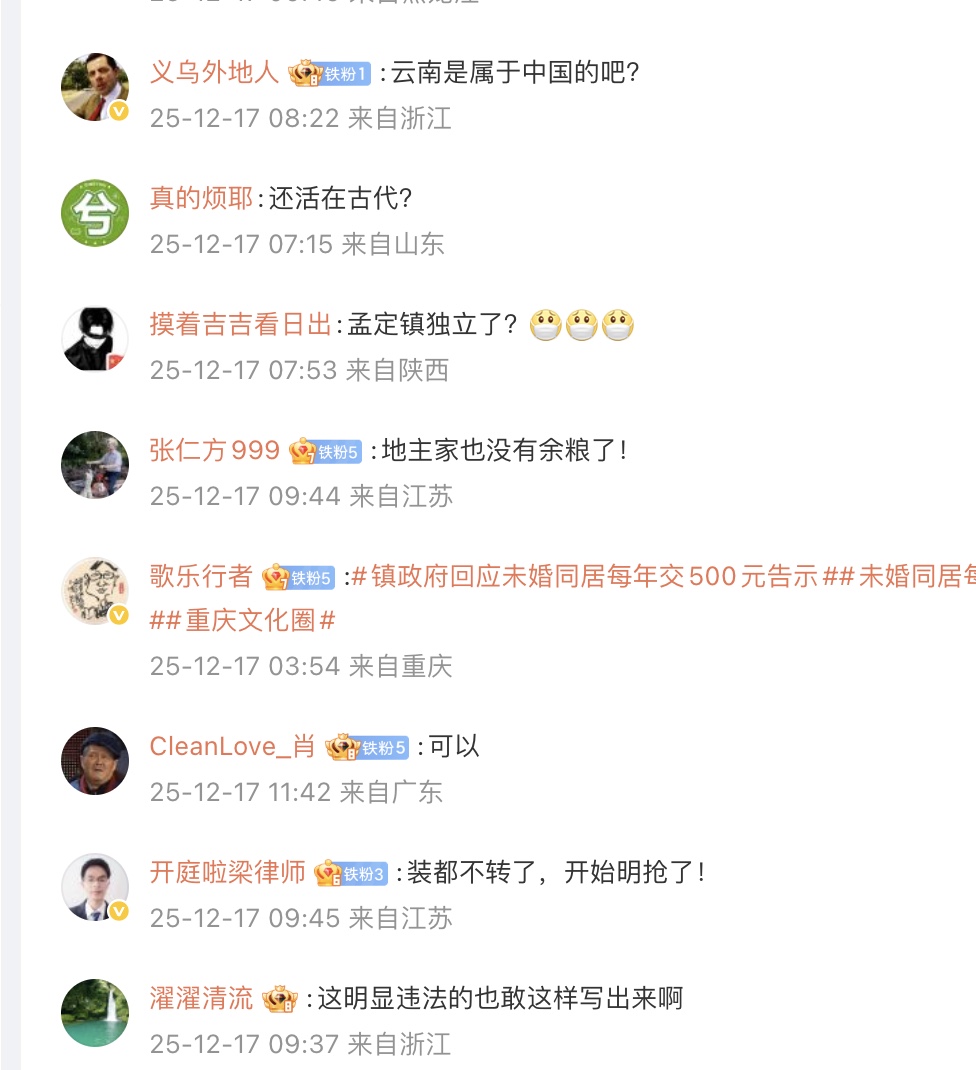還有網友嘲諷,「他們怕是要獨立了」「啊,孟定鎮獨立了?」「這是村還是國」「敢私立法規斂財?」「雲南是屬於中國的吧?」