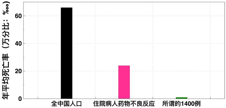 而根據《中國統計年鑑1996》,在1990年到1996年七年中,全國人口正常的年平均死亡率為萬分之六十六。而據國內醫藥學專業期刊提供的數字,中國住院病人中因藥物不良反應而死亡的死亡率至少是萬分之二十四。退一萬步說,假定這1400例是真的,那麼它恰恰證明了法輪功在祛病健身方面的功效。(見圖一)而事實是,「1400例」完全是中共炮製出來的用以栽贓法輪功的虛假案例。(參閱明慧網視頻:被重複了一千遍的「1400例」)