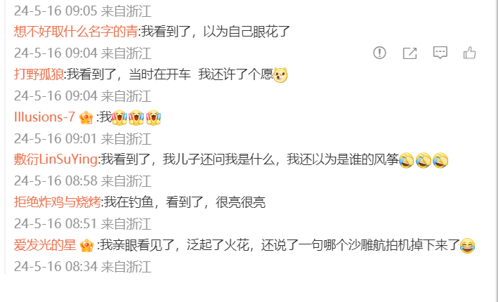 「剛剛蕭山這邊有消防車,是這顆石頭嘛」、「我看見了!藍綠色的帶火花,巨漂亮,離我公司很近」、「我看到了,當時還以為是誰家無人機墜毀了,但尾部拖著一團藍綠色的光,也不太像無人機~ 」、「我看到了,好美,五角星形狀,周圍帶著光,還許了願望哈哈哈」。