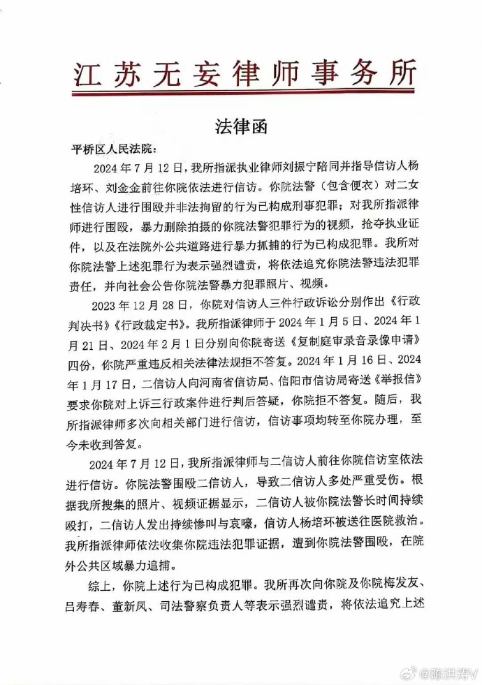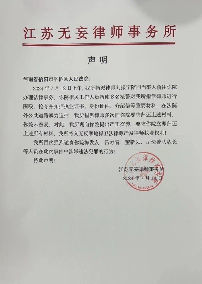 據網絡流傳的江蘇無妄律師事務所法律函顯示,7月12日,執業律師劉振寧陪同信訪人去法院信訪,法院法警對兩位女性信訪人圍毆、非法拘留,對律師圍毆,搶奪執業證書,暴力刪除律師拍攝的視頻。
