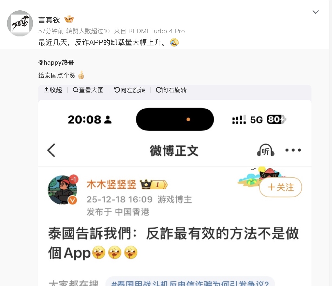 12月18日,大陸社交平台網友紛紛質疑,「泰國告訴我們:反詐最有效的方法不是做個app」「反詐APP沒一點N用,還是泰國給力」「電詐電話,為什麼以前禁止不了呢? 」「默默地卸載了手機上的『反詐APP』」「最近幾天,反詐APP的卸載量大幅上升」「這幾天的確騷擾電話少了很多,搞得我以為手機壞了」。