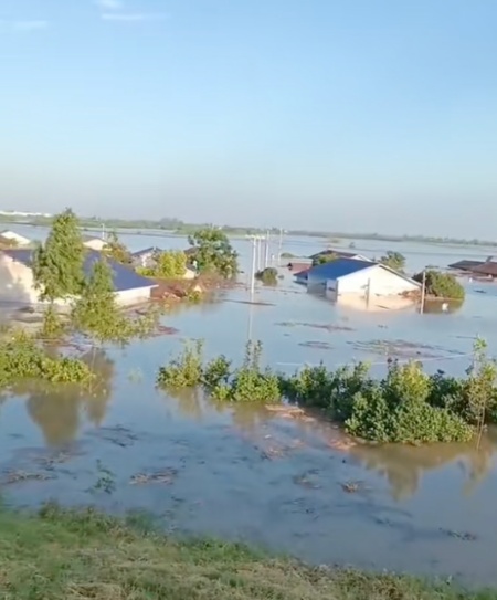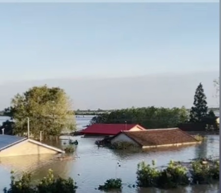 視頻畫面顯示,凶猛的洪水不斷湧入堤壩旁邊的村莊,房屋瞬間被淹,被沖毀。附近村民聽聞堤壩決提,趕緊逃離。短短幾個小時,洪水就漫過村民的房頂。