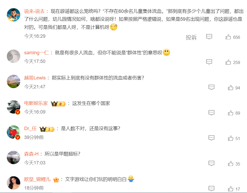 網友紛紛發帖質問:「現在闢謠都這麼籠統嗎?『不存在60餘名兒童集體流血』那到底有多少個兒童出了問題,都出了什麼問題,幼兒園情況如何,啥都沒說呀!如果按照嚴格邏輯說,如果是59名出現問題,你這闢謠也是對的。可是我們都是人呀,不是計算機呀!」。