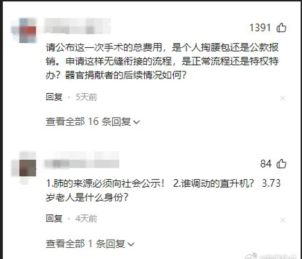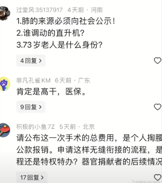 有網友直接質問深圳市衛健委,對於直昇飛機運送肺臟給老楊這種無縫銜接的流程,是「正常流程還是特事特辦」、「自掏腰包還是公款報銷」等。