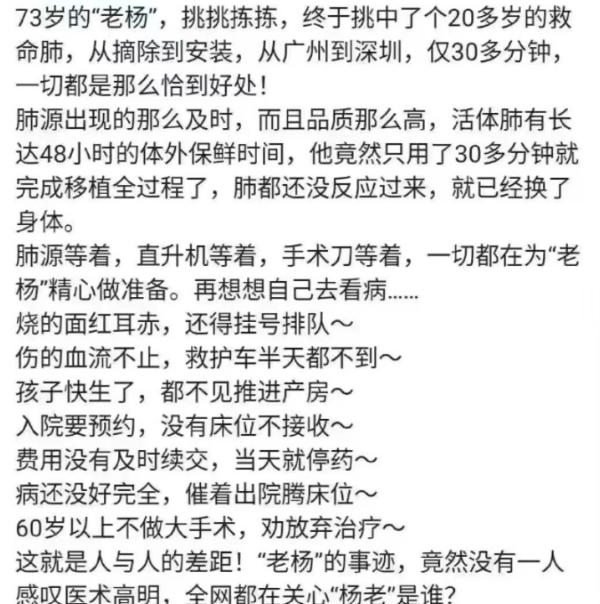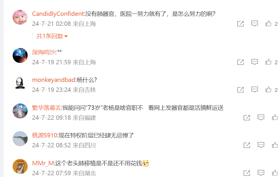 還有網友說,「換作普通人,這麼大的年齡,一般醫院都不會進行手術,都是建議病人保守治療,而老楊73歲的高齡依然能夠移植肺移植,只能說老楊家裡非權即貴」、「現在特權階層已經肆無忌憚了」、「看好自己家孩子」。