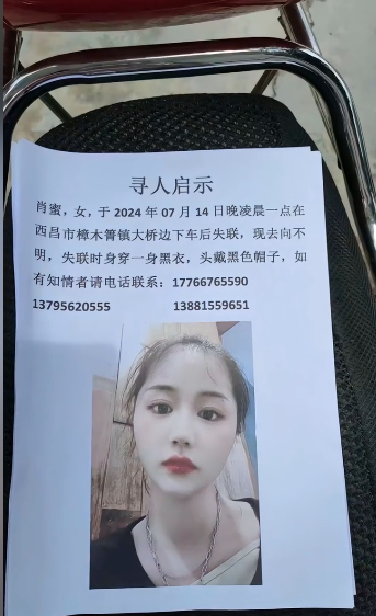 2024年7月14日凌晨一點, 西昌24歲女子肖蜜帶母親在醫院看完病後獨自乘坐出租車回樟木箐鎮的家,在檬木箐鎮大橋附近下車,之後失蹤,她的手機被路人撿到,「手機裡卻沒有留下關於失聯的信息」,至今也沒有消息。