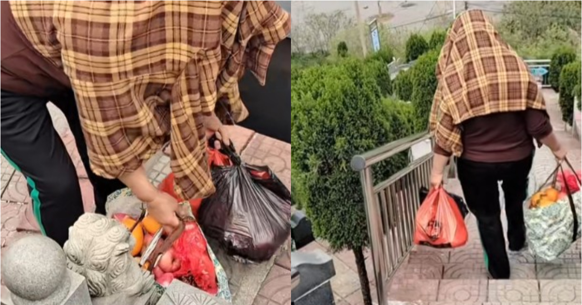 視頻中可見,她收走的水果看起來很新鮮,應該是別人剛剛放置不久的供品,離開墓園時,這位女士兩手吃力的提著滿滿幾袋供品,看上去至少有幾十斤。