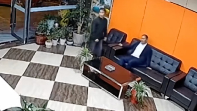 與袁某某一同前來的男子拉著他準備離開酒店,門口進來一位女士,袁某某對著她踹了一腳,自己也站立不穩,差點摔倒。他身旁的男子趕緊扶著他,兩人罵罵咧咧地走出了酒店。