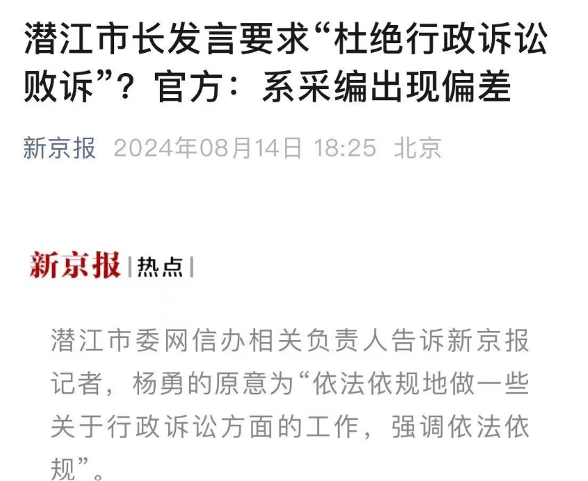 8月14日,《新京報》報導,潛江市官方稱,該言論發布系新聞稿件採編過程出現偏差,導致信息發布出現錯誤,涉事媒體已經重新審核,修改更正。