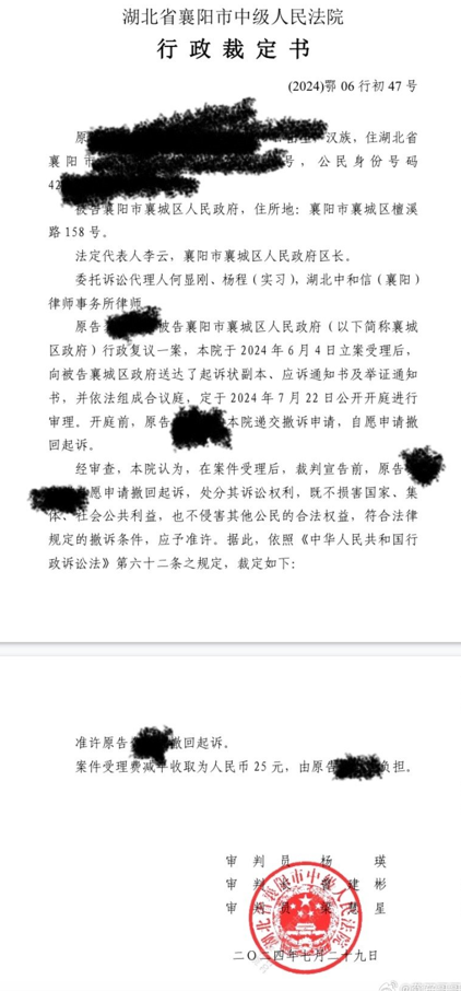 一份公開的湖北襄陽市中級法院裁定書顯示,7月29日,湖北襄陽市市民控告襄陽市襄城區政府的訴訟案,原告申請撤回起訴。
