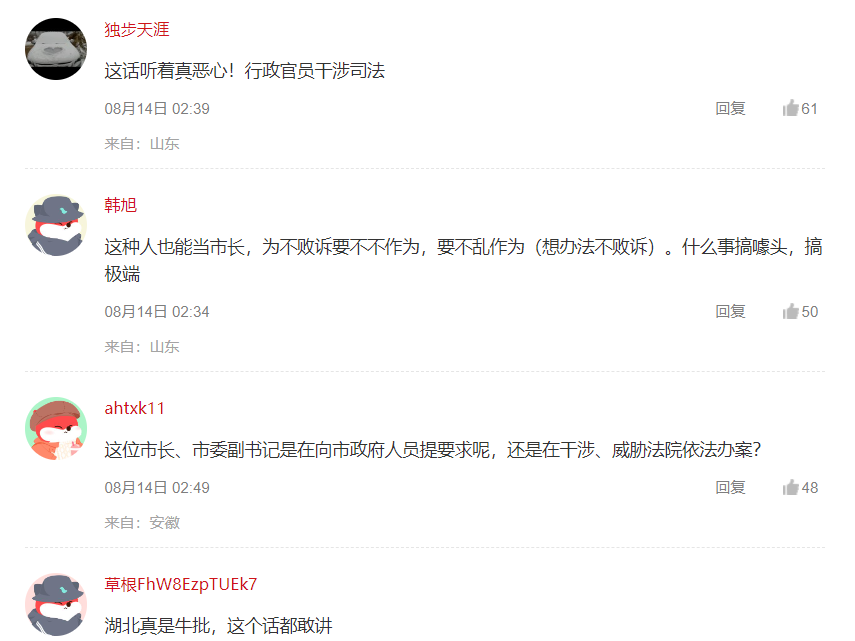 網友批評說,「這位市長、市委副書記是在向市政府人員提要求呢,還是在干涉、威脅法院依法辦案?」「這話聽著真噁心!行政官員干涉司法」「市長你連裝都不裝了嗎?那《行政訴訟法》還有必要存在嗎?」。
