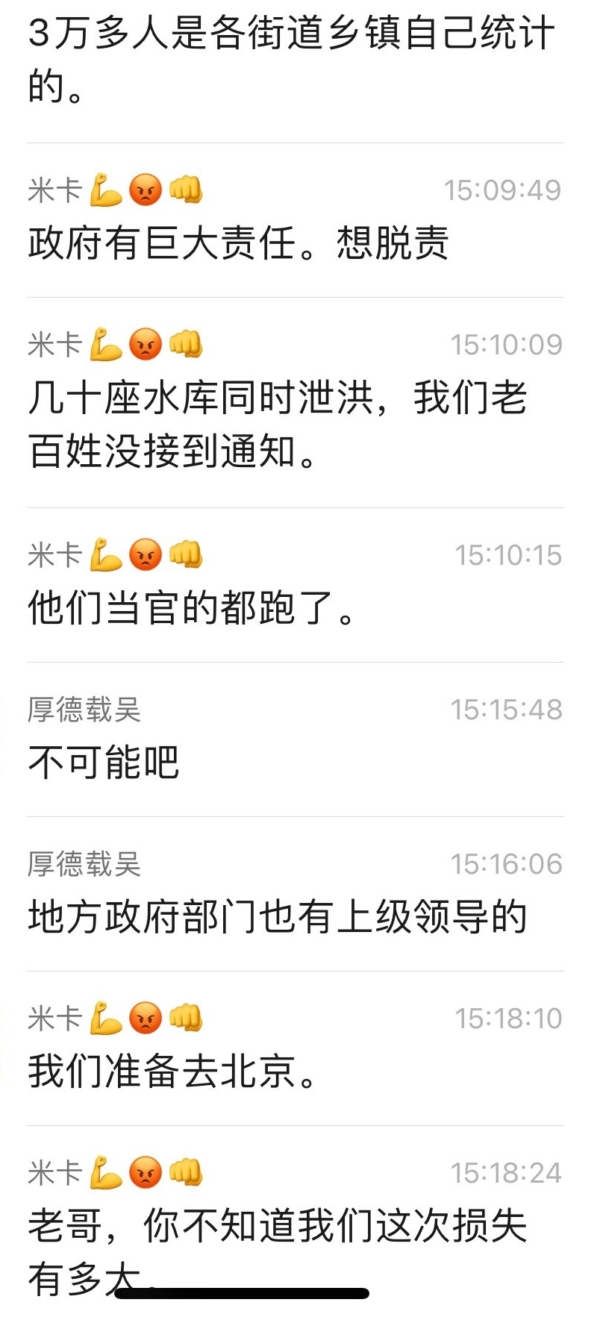 據他介紹,大水是半小時內沖進來的,她們站在高處就看見很多人被洪水沖走。來自街道鄉鎮的初步統計,至少3萬多人失聯,鄉鎮最慘。官方則封殺消息,他們準備去北京(上訪)。
