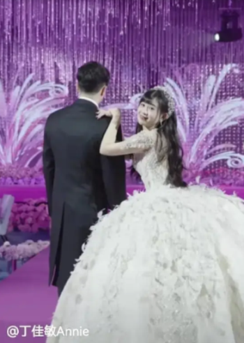 在丁佳敏發布的視頻中,只見她身著婚紗、頭戴皇冠,站在婚禮站台上,一旁的新郎正是七匹狼二公子周力源,配文是「校服是你,婚紗也是你」。在視頻下方,兩位新人的親友們紛紛留言對兩位新人表示祝福。
