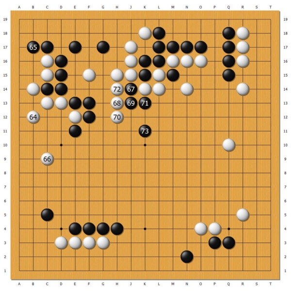 實戰行至黑73手,申真諝將白棋一分為二,進行纏繞攻擊,井山裕太早早陷入苦戰。