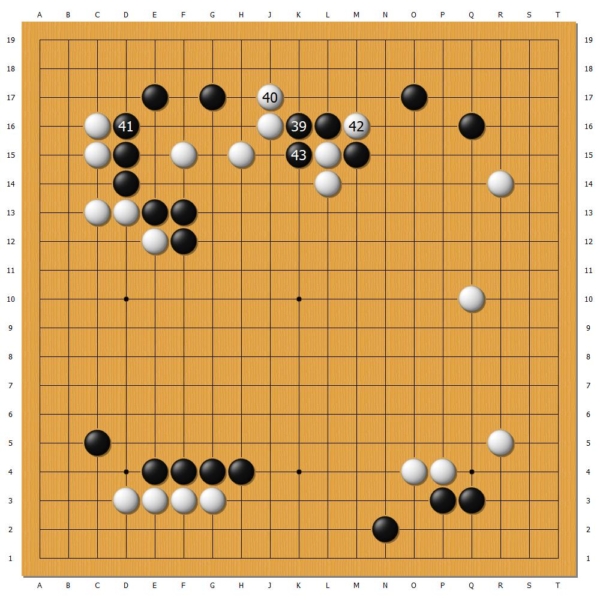 本局,申真諝執黑先行。序盤,二人在上方角力,井山裕太在自身棋形不厚的情況下,白40、42手發力過猛,遭到對手精準反擊,勝率也隨之跌至個位數。