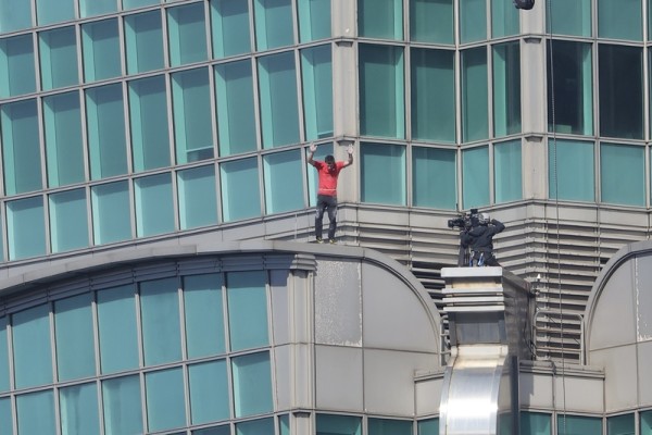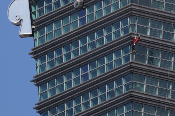 上午10點43分,他成功登頂,站在高空中揮手向地面群眾致意,還拿出手機自拍。並形容,能用這樣的方式俯瞰台北,是一種非常不可思議、也非常美好的體驗。隨後他利用繩索垂降,和在平台等待的太太桑妮開心擁抱,最後和攝影團隊一起搭電梯下樓。
