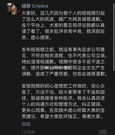 5月9日凌晨,百度副總裁璩靜在朋友圈發文道歉。