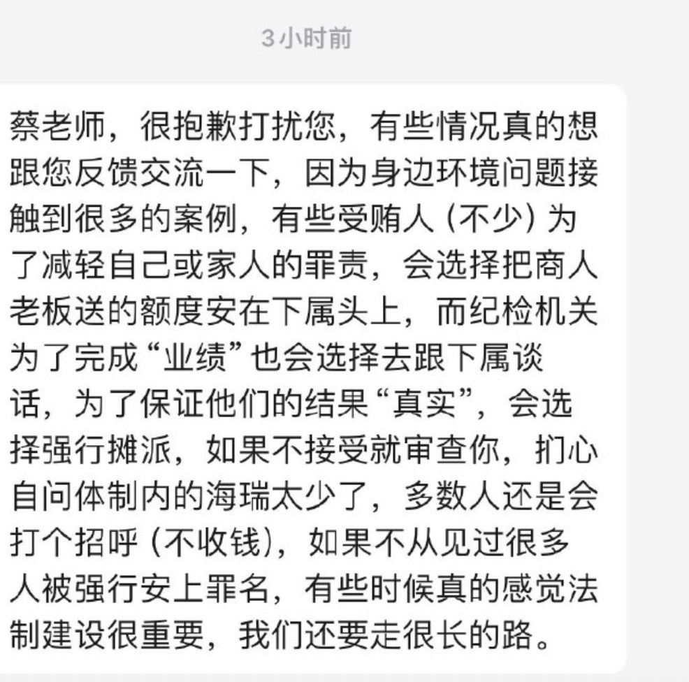 微博知名法律博主近日發帖爆料一網友發來的私信,稱中共紀委為了完成「業績」給官員按罪名。