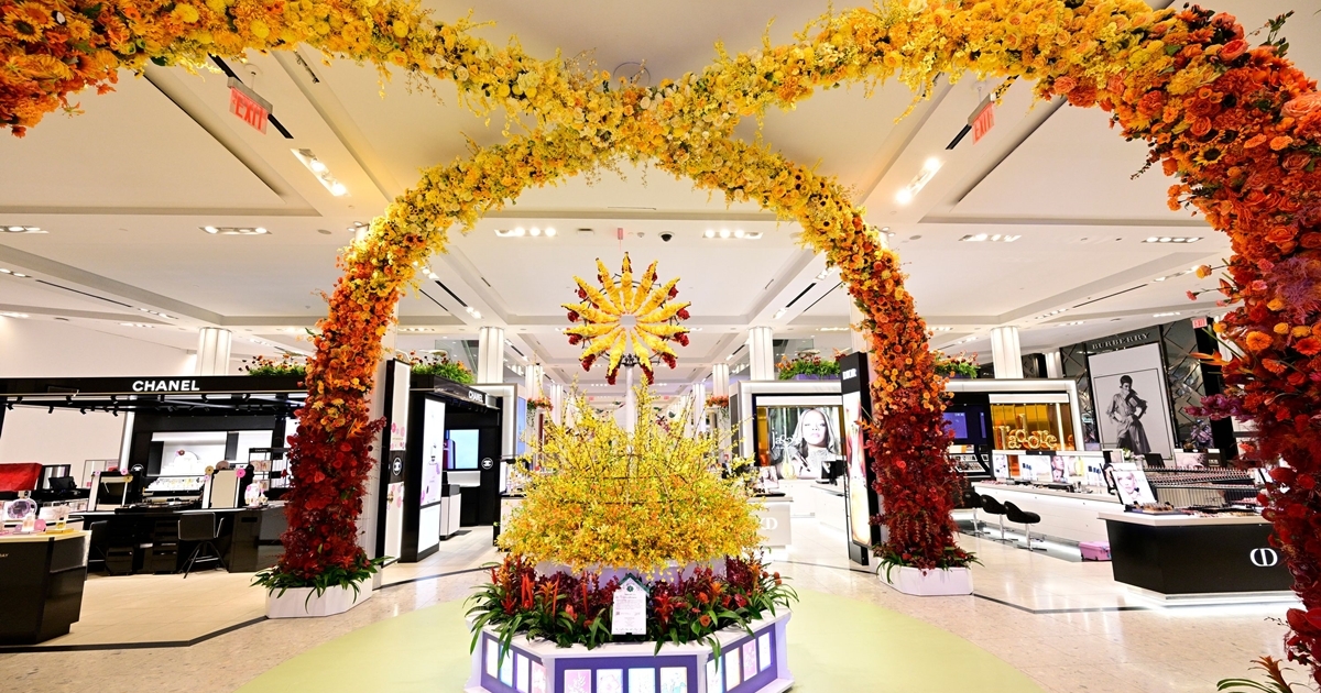 走進梅西百貨,一座巨大的花藝拱門映入眼簾。色彩由鵝黃緩緩過渡至熱烈的紅,像季節的流轉,將人帶入春與夏交會的瞬間。拱門下,三色圓形花輪翻轉,吸引人們駐足留念。
