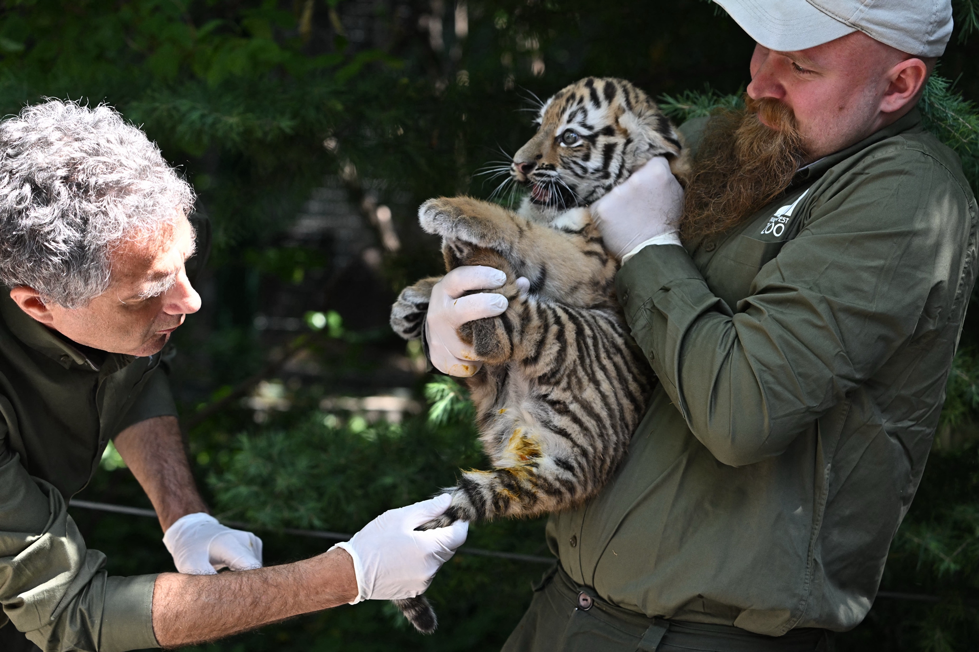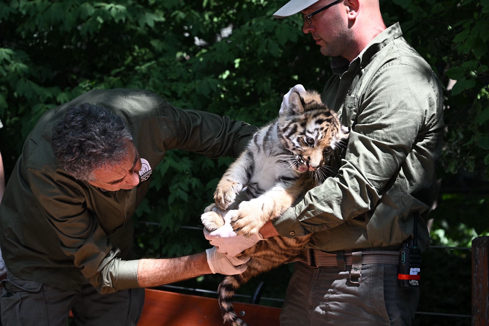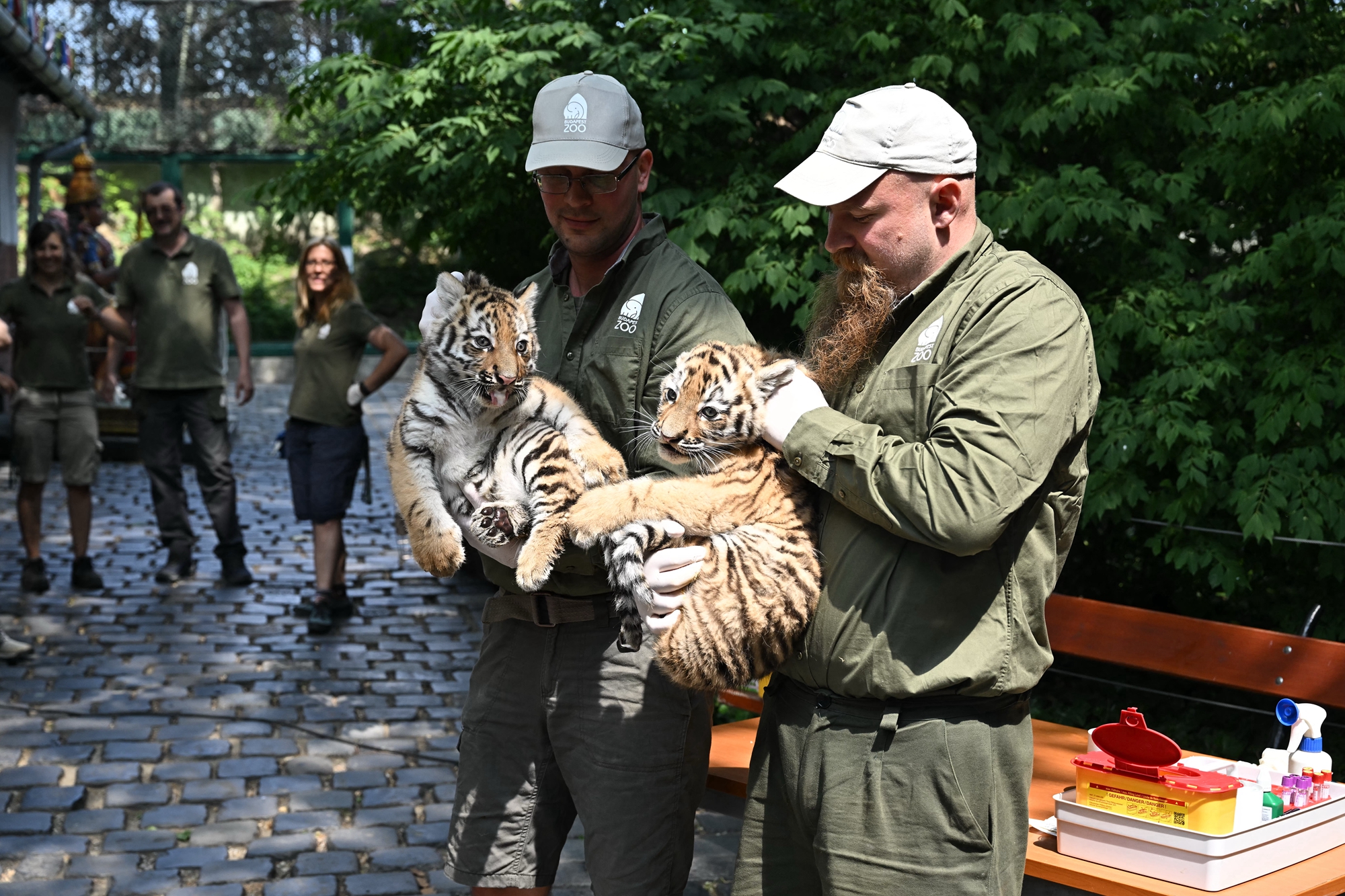 週四(6月12日),這對稀有的虎寶寶在布達佩斯動物園(Budapest zoo)接受首次體檢和疫苗接種,並首次在媒體面前亮相。布達佩斯動物園坐落在匈牙利首都布達佩斯市中心的城市公園內,於1866年對外開放,是歐洲最古老的動物園之一,現已成為歐洲重要的動物保育與展示機構。