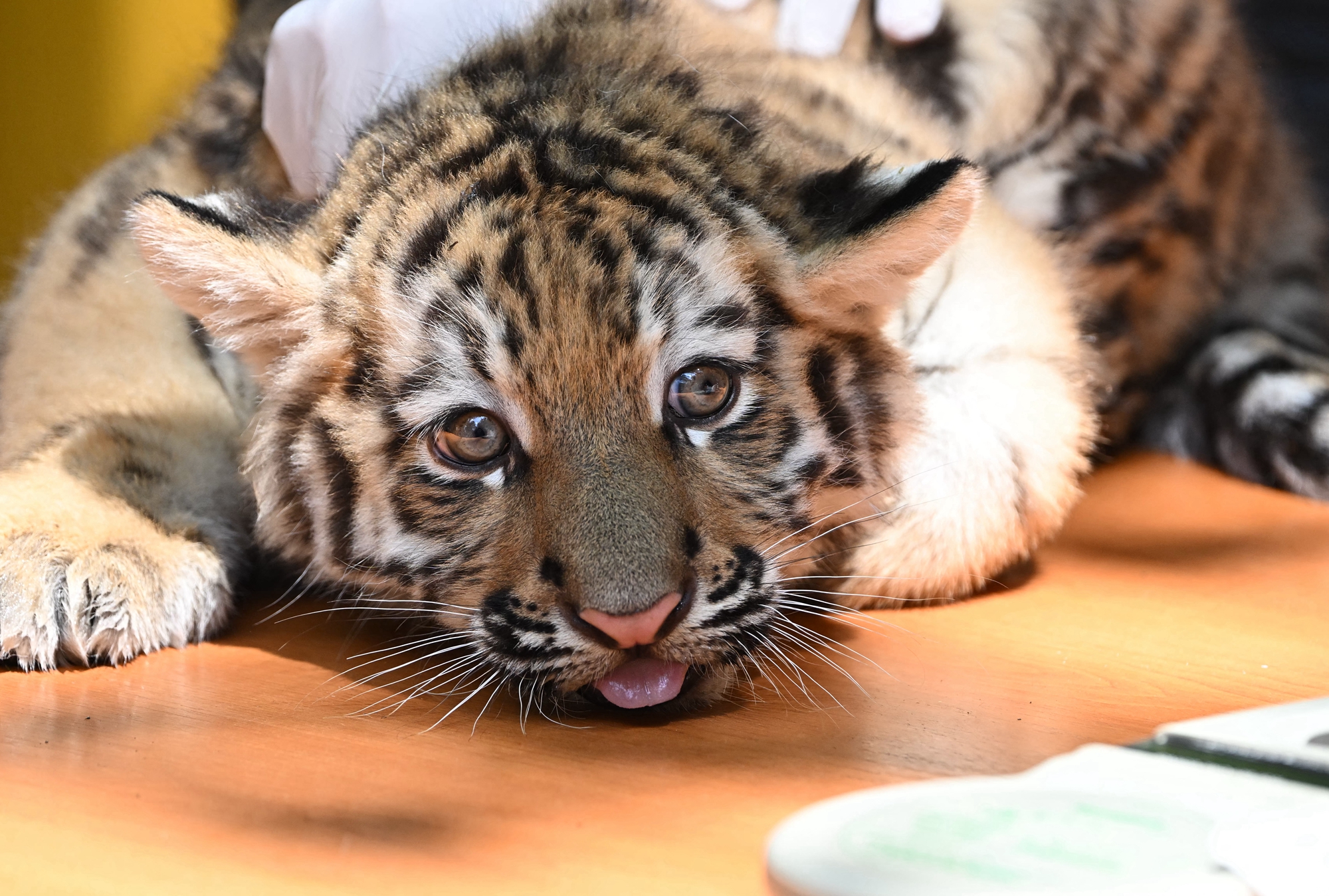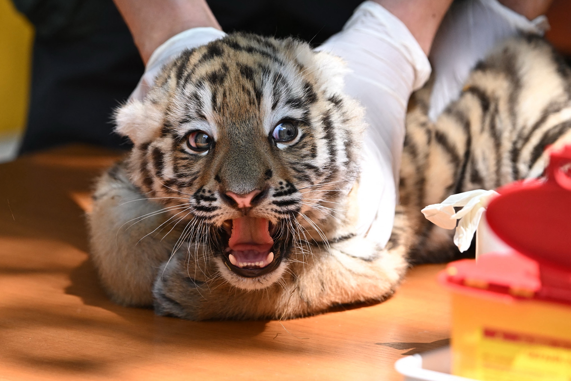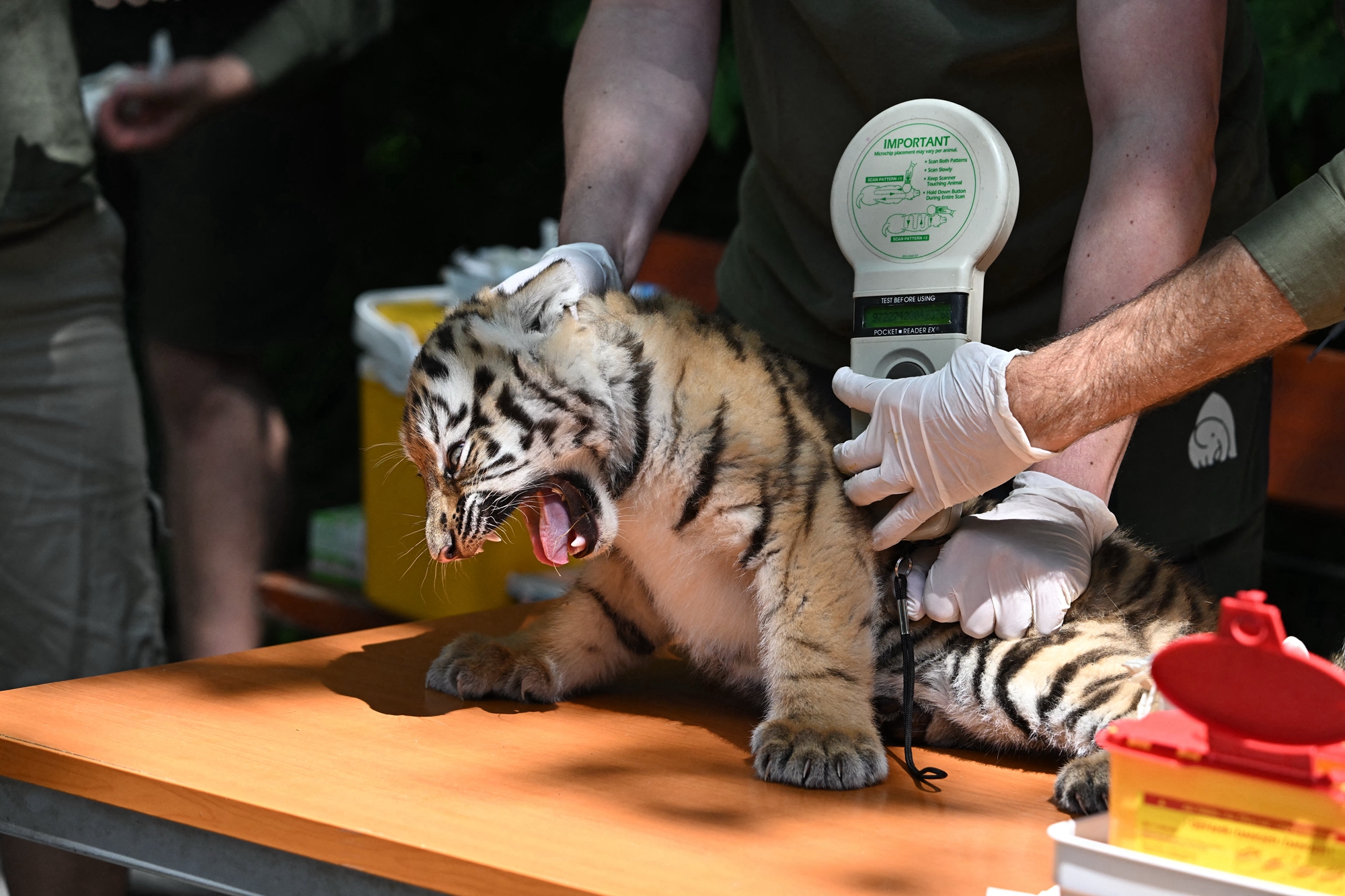 週四(6月12日),這對稀有的虎寶寶在布達佩斯動物園(Budapest zoo)接受首次體檢和疫苗接種,並首次在媒體面前亮相。布達佩斯動物園坐落在匈牙利首都布達佩斯市中心的城市公園內,於1866年對外開放,是歐洲最古老的動物園之一,現已成為歐洲重要的動物保育與展示機構。