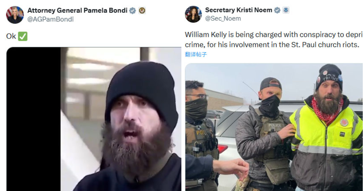 當天國土安全部部長諾姆(Kristi Noem)也發布推文,公布了威廉‧凱利被抓的照片,並宣布:「威廉‧凱利因參與聖保羅教堂騷亂而被控串謀剝奪權利,這是一項聯邦罪行。」