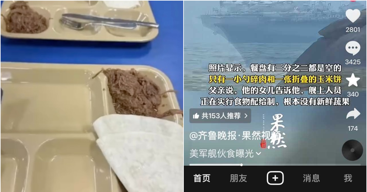 報導還引用視頻稱,在「的黎波里」號軍艦上,一份午餐托盤三分之二是空的,只盛著一小勺肉絲和一張折起來的薄餅;而「林肯」號航母上的晚餐照片中,幾塊水煮胡蘿蔔、一塊乾巴巴的肉餅,還有一塊泛灰的加工肉製品,「難以下咽」。