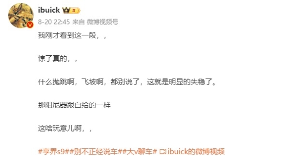 該視頻迅速引發關注。另一名車評人「@ibuick」表示,這情況發生的主要原因是享界S9懸掛匹配「有問題」,阻尼(damping)的調校並沒有「在線」,導致面對這些本輕易應對的低速過坡,出現了失準的表現。