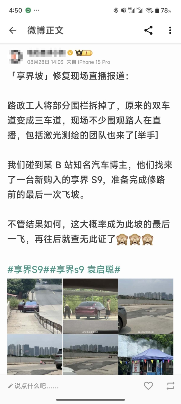 隨後,袁啟聰與另外一些堅稱享界s9不會顛簸轉向的車評人展開爭論,輿論持續發酵。許多博主紛紛到測試地點進行「飛坡測試」,「享界坡」因此出名。