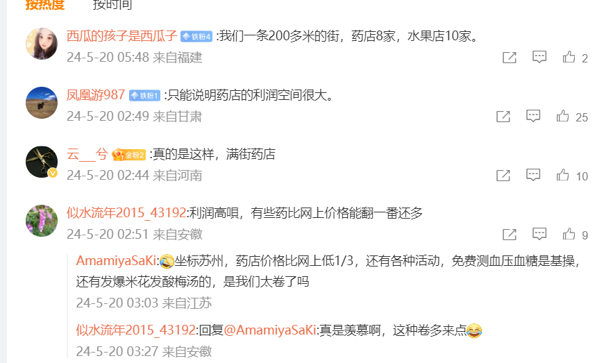 在此視頻評論區,網友紛紛表示,「到處都一樣」、「不僅是溫州,偏遠落後的內蒙古這3.4線城市小區周圍10家藥店不止,尤其小區門口基本50米一個」、「確實,不要說是城區,在這普通的鄉鎮五十米裡就有三家藥店」、「只有溫州這樣嗎?我家這邊七八線小城市,城區長住人口估計只有20萬,藥店怎麼著也得100大幾家啊」。
