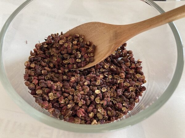 準備一把新鮮花椒,洗淨控乾水分。然後將花椒磨碎,放入一個小碗中,再加入少量溫開水浸泡10分鐘。期間筷子攪拌一下,待花椒的味道完全溶解在水中,就製作完成了。