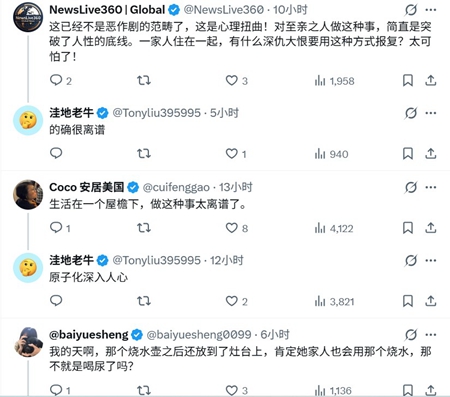 「這已經不是惡作劇的範疇了,這是心理扭曲!對至親之人做這種事,簡直是突破了人性的底線。一家人住在一起,有什麼深仇大恨要用這種方式報復?太可怕了!」