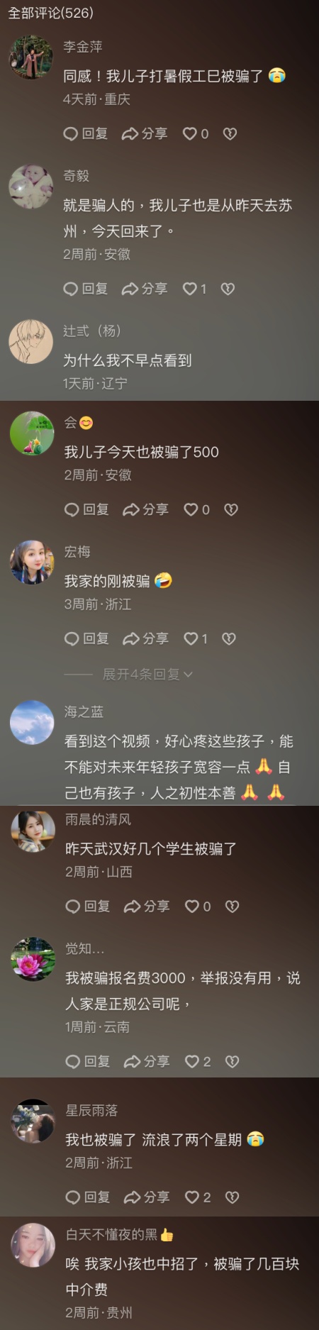 還有許多學生家長表示:「自己的孩子打暑假工也被騙了。」