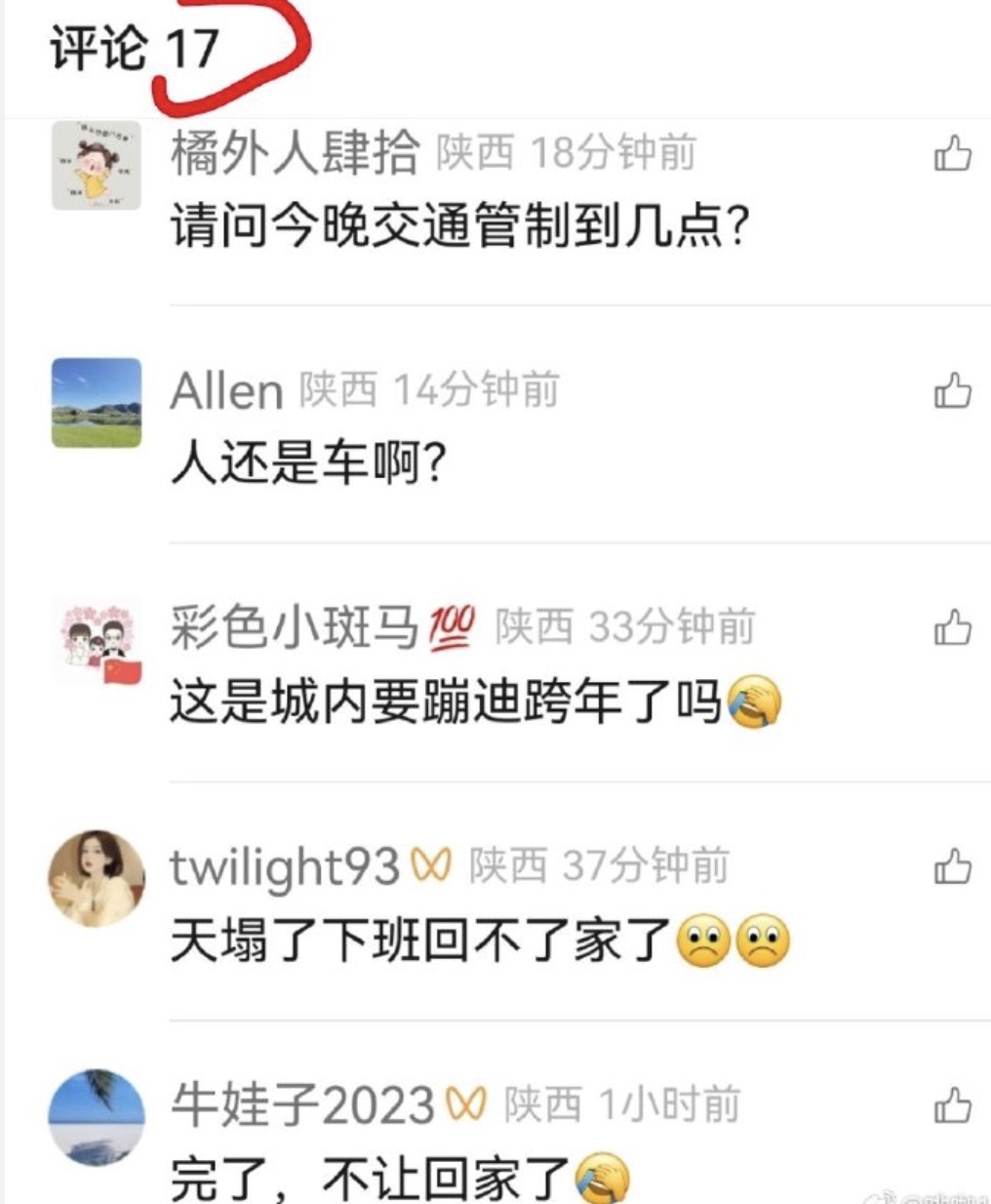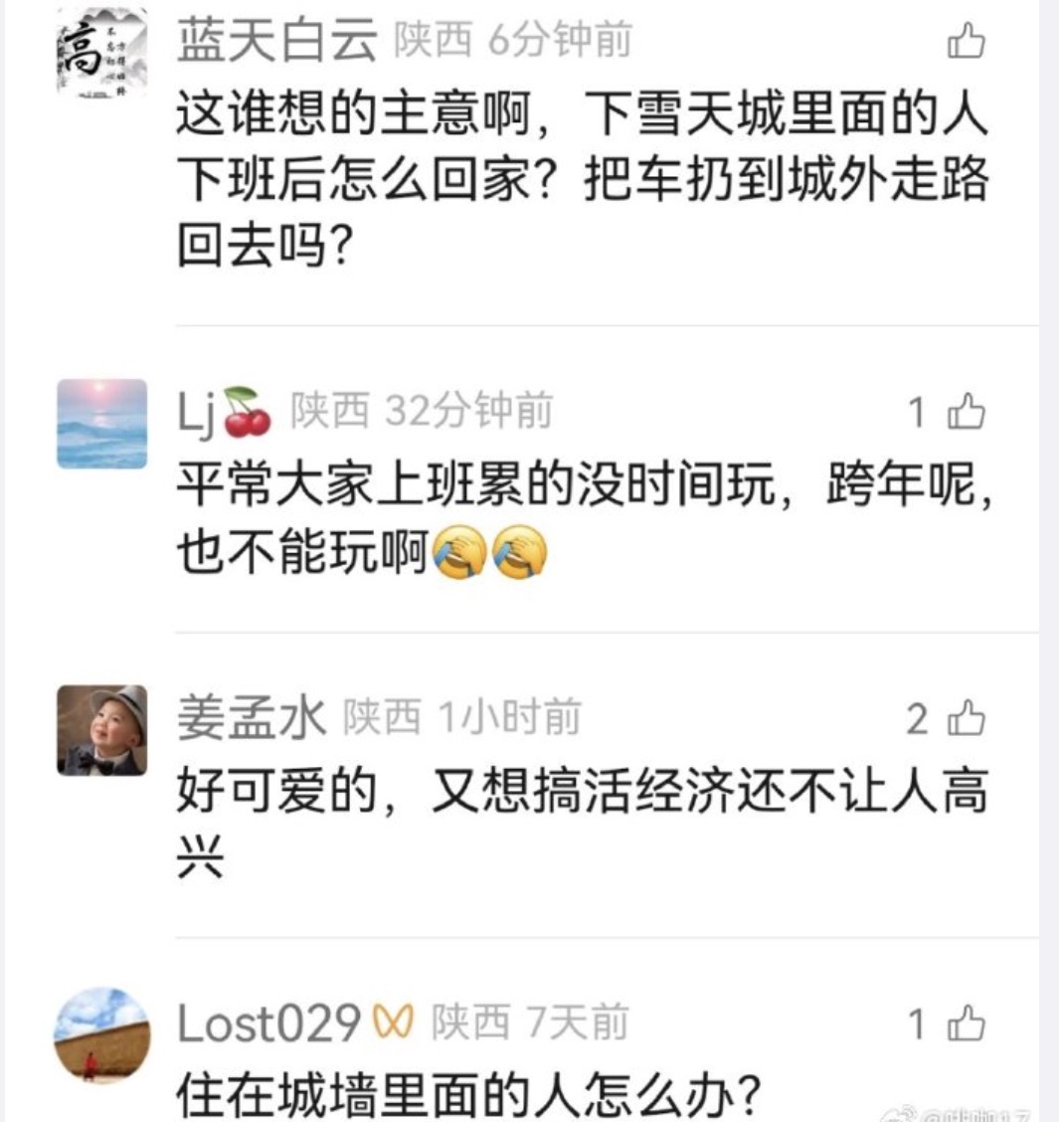 當地網友紛紛質疑,「住在城裡面的人怎麼辦?」「誰想的主意啊。下雪天裡面的人下班後怎麼回家?把車仍在城外走路回去嗎?」「天塌了下班回不了家了」,「完了,不讓回家了」。