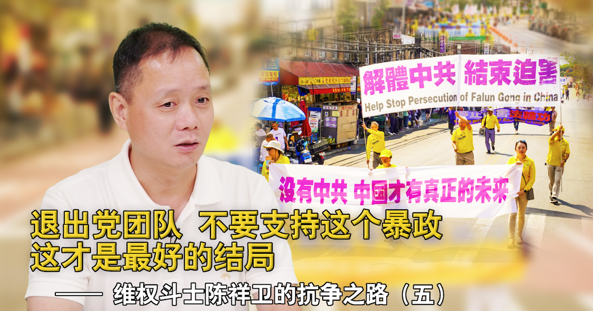 在採訪的最後,陳祥衛向所有中國老百姓發出呼籲。他希望大家能提高自己的意識,看清現實,儘快勇敢地退出黨團隊,回歸本色,不再支持這個暴政。他深知這樣的抗爭充滿艱難和危險,但他說:」如果暴政繼續存在,對整個中國、對整個世界,都不會有安寧。」