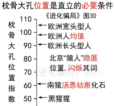 1925年後,枕骨大孔位置就成了衡量直立行走的一個重要指標,後來非洲發現的「人類祖先」大都在這上造假,偽造直立,後文會漸次起底。