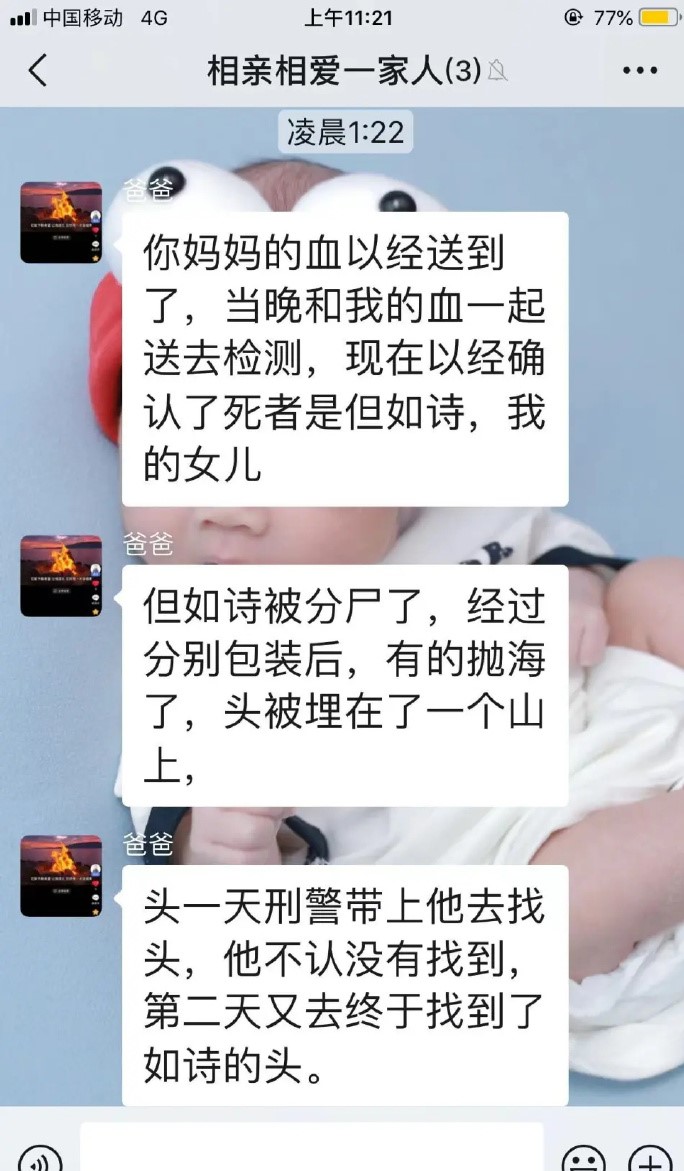 死者家的微信群信息顯示,死者的父親說,但如詩被分屍了,經過分別包裝後,有的拋海了,頭被埋在了一個山上。