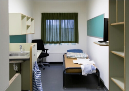 每個牢房內放有一張床、桌子、櫥櫃、馬桶、洗手台、電視和一個對講系統,當門被鎖上時, 在押人員可以用對講系統聯繫獄卒。