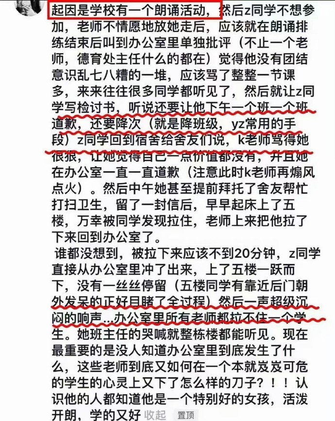 據網民反映,該校「七一」期間有省官員來視察,學校要求每個組出一個節目,該女生不想參加,就被年級副組長徐某、德育處副主任康某某在辦公室訓斥了一上午。中午時分,她未返回宿舍,隨後留下遺書,就從五樓教學樓跳樓,幸被同學救下來。