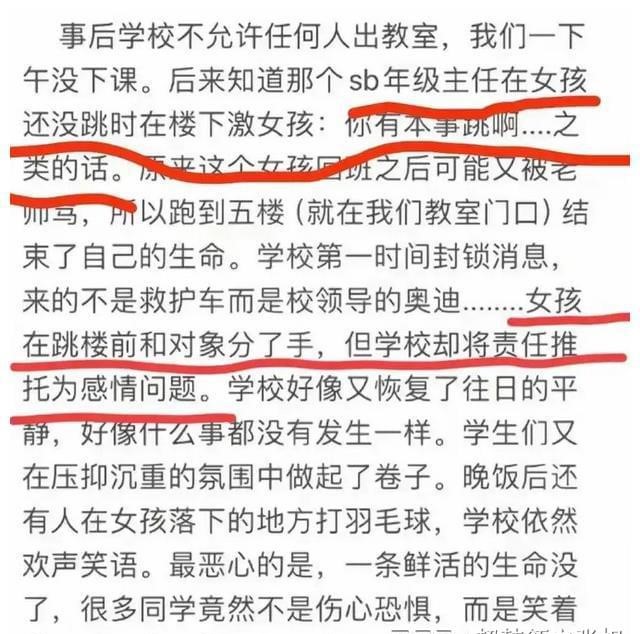 大V「MY希澈Mine」表示,就是這麼簡單的幾句話就結束了這一墜樓事件的始末,這怎麼感覺校園霸凌從老師這個源頭就開始了,別說什麼孩子心裡脆弱,無緣無故的怎麼就非得跳樓了?別蒙著眼就說黑了,不要每次都是有事發生,而且都是用生命作為代價,再來說什麼加強管理加強疏通,從源頭上杜絕吧,失去生命的痛你們承擔不起!