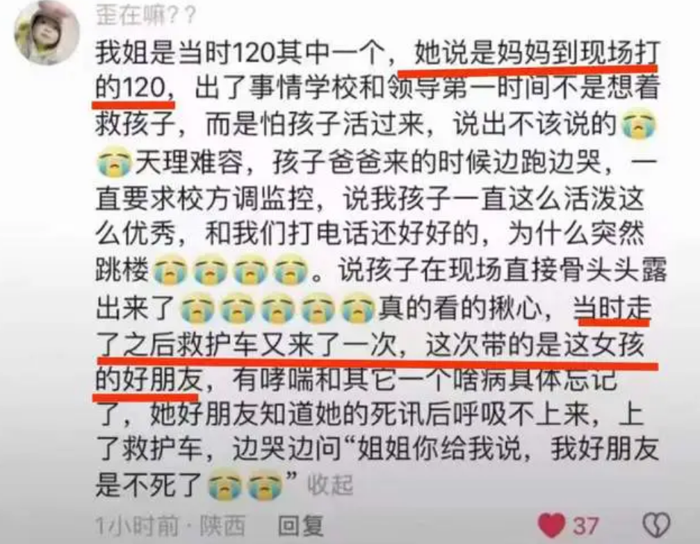 知情人透露,事發後,學校第一時間封鎖了消息,也沒有撥打 120,救護車是女生媽媽趕到學校時才叫的。