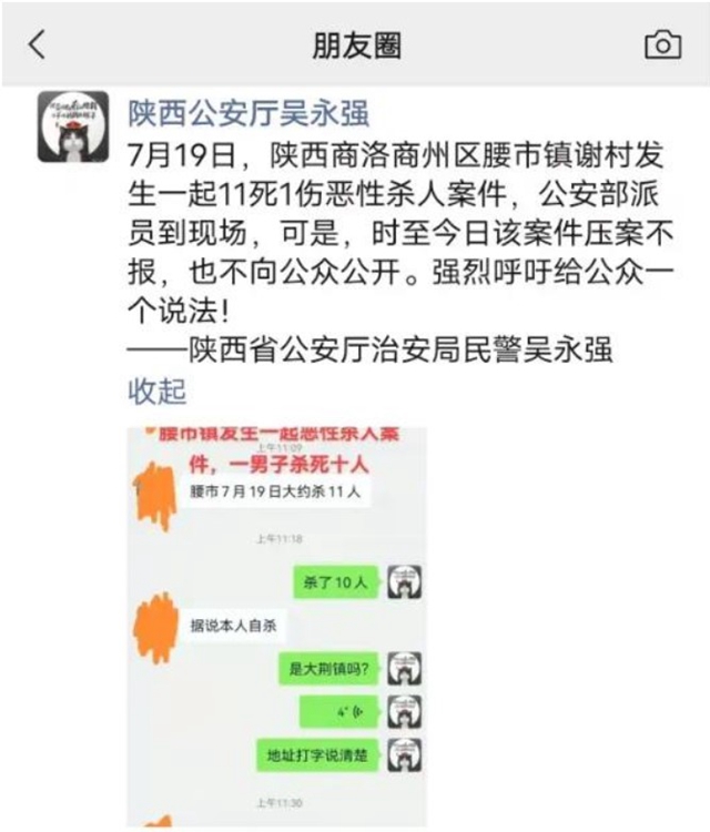 據來自中國大陸微信截圖信息,陝西一名警察吳永強在朋友圈發布消息稱,2024年7月19日,陝西商洛市商州區腰市鎮謝村發生一起11死1傷的惡性殺人案件,公安部派員到場,但至今壓案不報,據說上頭有指令不得報導。