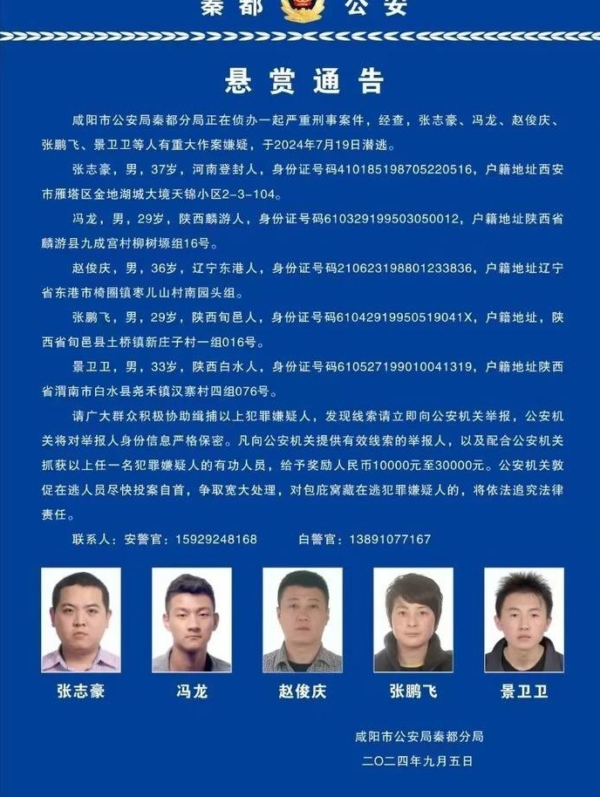 9月5日,中共咸陽警方發布一則懸賞通告,稱該局正在偵辦一起嚴重刑事案件,張志豪、馮龍、趙俊慶、張鵬飛、景衛衛等5人有重大作案嫌疑,於2024年7月19日潛逃。