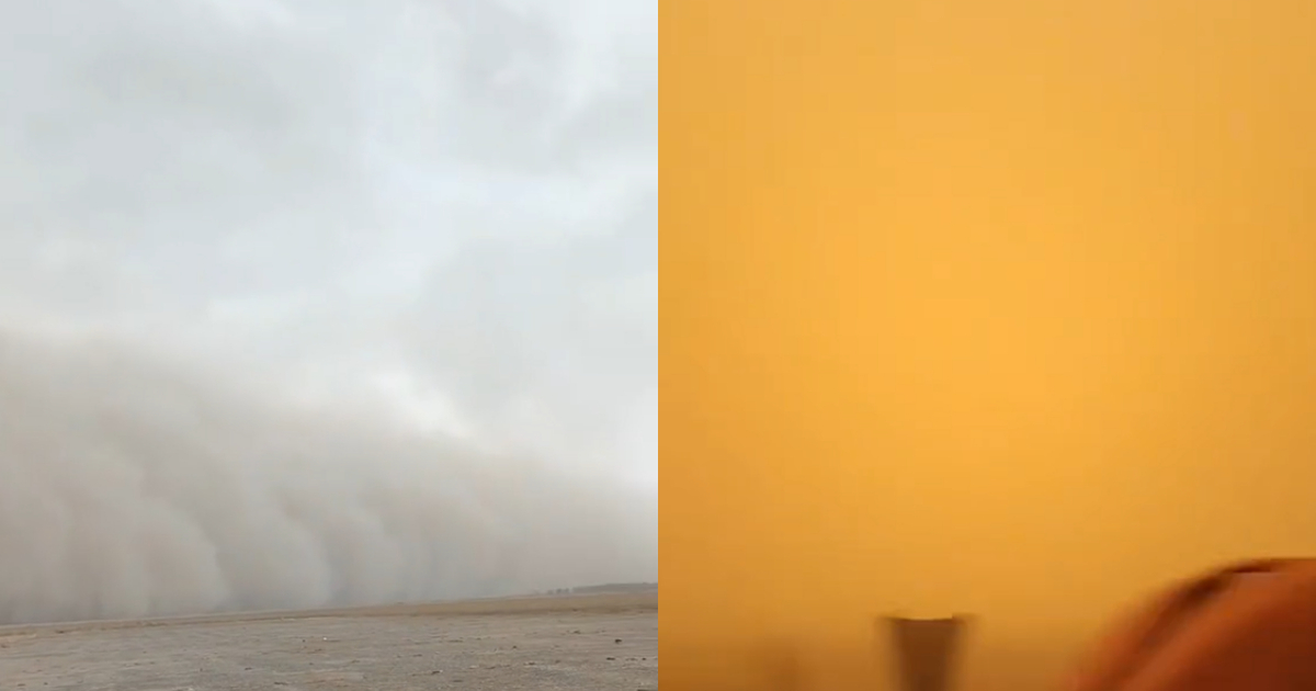 網傳的多個視頻顯示,整個天空全是橙黃色的沙塵,灰濛濛一片,塵土飛揚,瞬間天昏地暗,高樓都被塵土遮蔽,若影若現。有網友表示,都不敢張嘴說話,一說話吸進去的是土,吐出來的是泥啊。