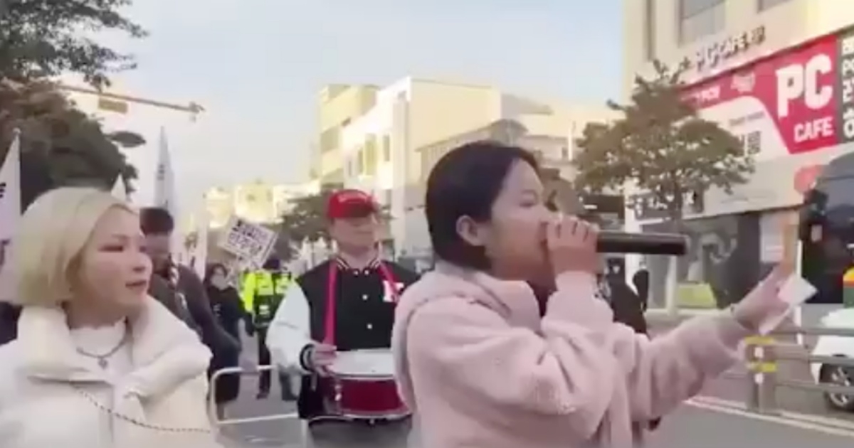 不少X平台網友轉發一則視頻,視頻中,一群韓國民眾在街上遊行,一名穿著粉色外套的韓國女孩,拿著話筒,用普通話大聲向街上的中國遊客們喊話:
