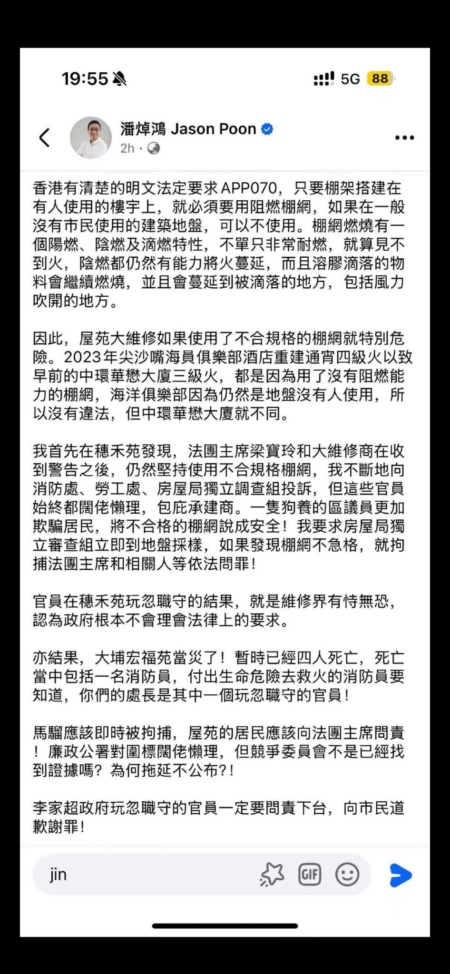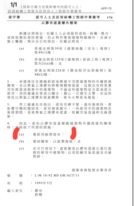 貼文引述多位香港網友發在社群媒體的評論指出,「大樓起火主要原因不在竹架,竹架在香港用了上百年都沒事。棚裝修施工方為香港宏業建築,因為偷工減料,本次大火的棚架保護網(尼龍網)的阻燃認證,由大陸濱州實驗室(CNAS認證)出具,取代了香港傳統的HOKLAS標準,為降低成本導致防火性能嚴重不足。香港消防處處長楊恩健早接到棚架保護網不合格的舉報,一直不作為,可能和建築方高層利益勾結。應該嚴查。」